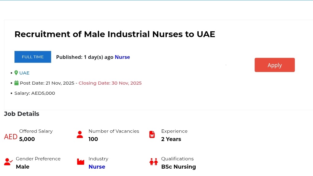 കേരള സർക്കാരിന്റെ സ്ഥാപനമായ ഒഡെപെക് (ODEPC – Overseas Development and Employment Promotion Consultants Ltd.) മുഖേന യുഎഇയിലേക്ക് (UAE) പുരുഷ ഇൻഡസ്ട്രിയൽ നഴ്സുമാരെ നിയമിക്കുന്നതുമായി ബന്ധപ്പെട്ട വിവരങ്ങളാണ് താഴെ നൽകുന്നത്. ഈ നിയമനം സാധാരണയായി സൗജന്യ റിക്രൂട്ട്മെന്റ് (Free Recruitment) ആയിട്ടാണ് നടത്തുന്നത്.