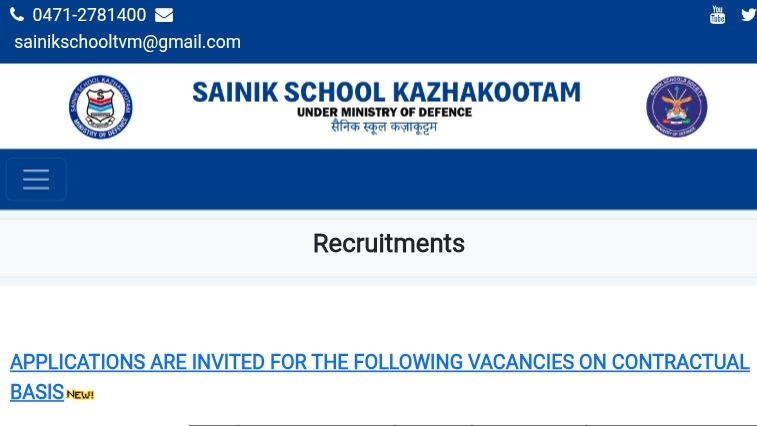 തിരുവനന്തപുരം സൈനിക് സ്കൂളിൽ (Kazhakootam) വിവിധ തസ്തികകളിലേക്ക് കരാർ അടിസ്ഥാനത്തിൽ (Contractual) നിയമനം നടത്തുന്നതിനായുള്ള വിജ്ഞാപനത്തിന്റെ വിശദാംശങ്ങൾ താഴെ നൽകുന്നു: