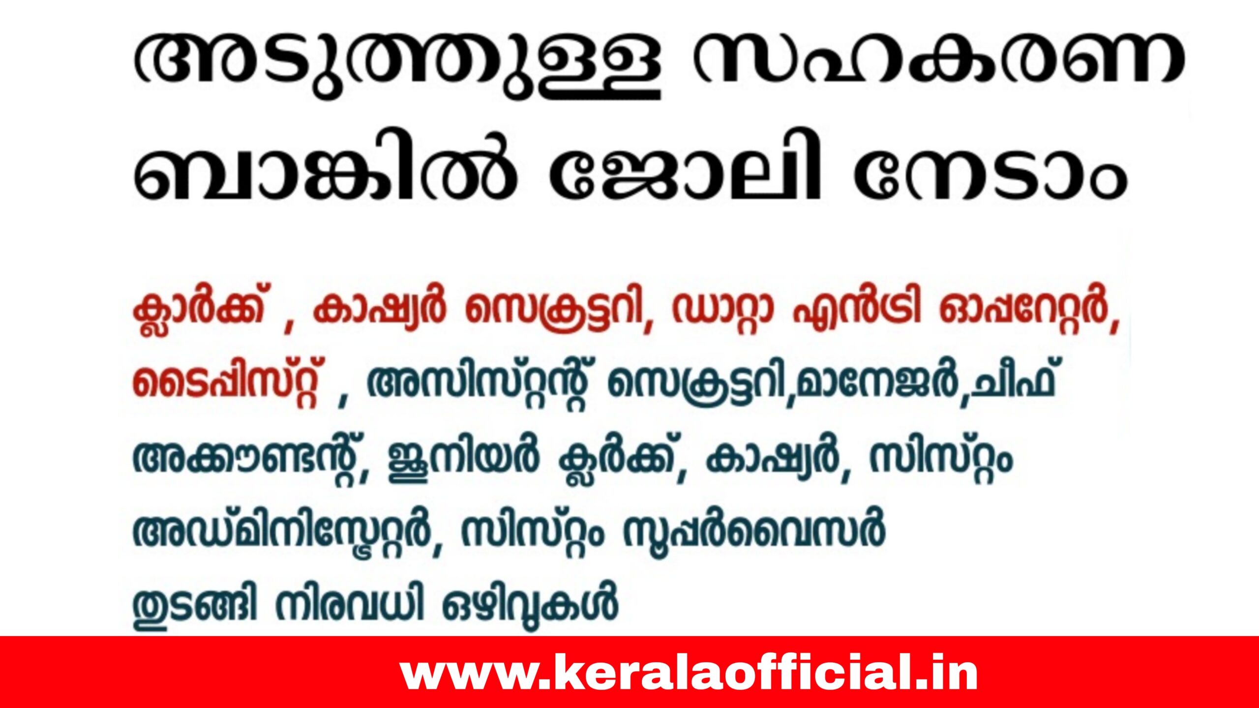 നിങ്ങളുടെ നാട്ടിൽ തന്നെ സഹകരണ ബാങ്കുകളിൽ ജോലി ആഗ്രഹിക്കുന്നവർക്ക് ഇതാ സുവർണ്ണ അവസരം. ജൂനിയർ ക്ലർക്ക്, കാഷ്യർ, സിസ്റ്റം അഡ്മിനിസ്ട്രേറ്റർ, ഡാറ്റ എൻട്രി ഓപ്പറേറ്റർ, ടൈപ്പിസ്റ്റ് തുടങ്ങിയ വിവിധ ഒഴിവുകളിലേക്ക് യോഗ്യരായവരെ നിയമിക്കുന്നതിനായി അപേക്ഷകൾ ക്ഷണിക്കുന്നു