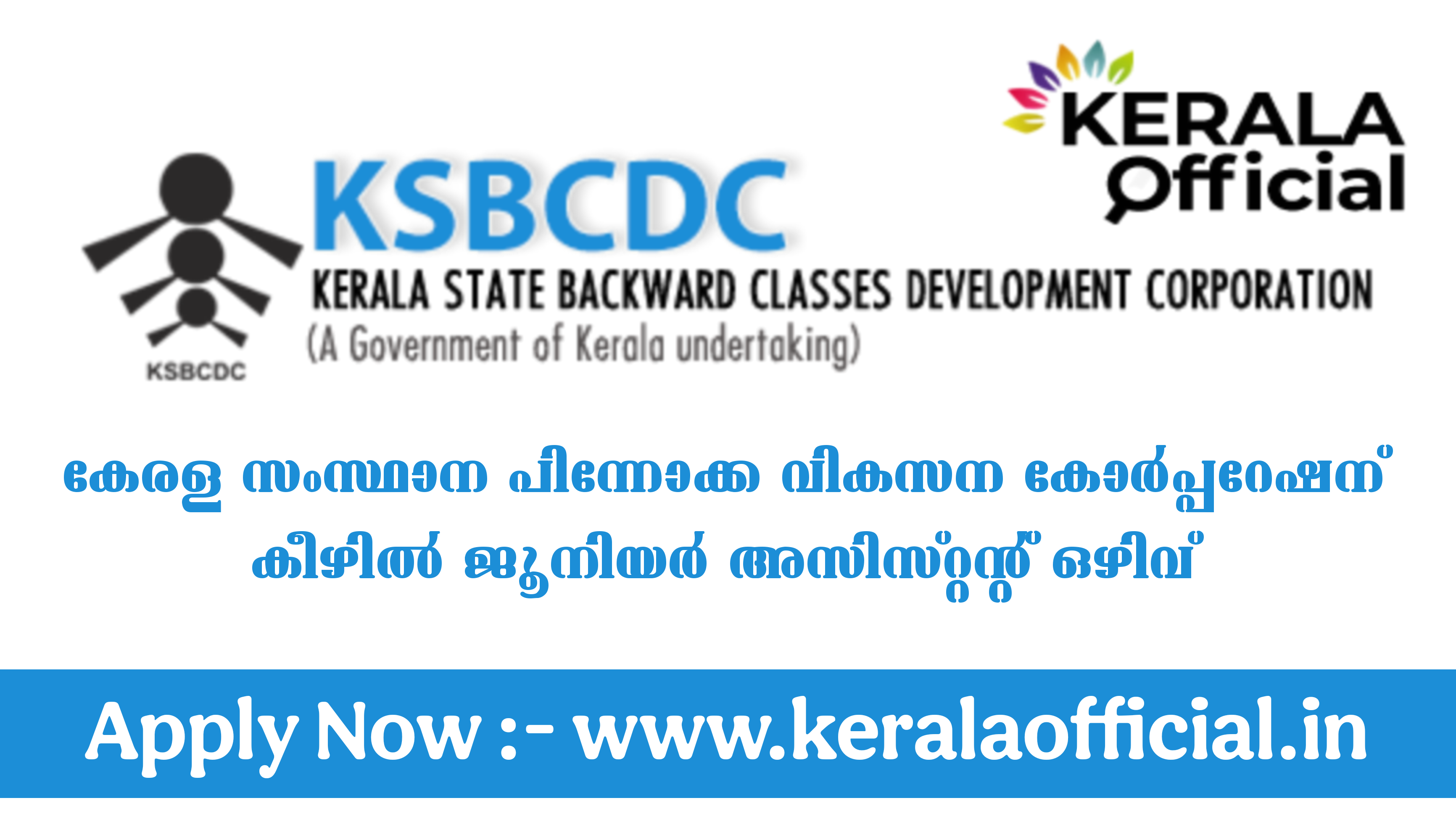 കേരള സംസ്ഥാന പിന്നാക്ക വിഭാഗ വികസന കോർപ്പറേഷൻ ലിമിറ്റഡിൽ (Kerala State Backward Classes Development Corporation Ltd.) ജൂനിയർ അസിസ്റ്റന്റ് തസ്തികയിലേക്ക് മുസ്ലീം സമുദായത്തിൽപ്പെട്ട യോഗ്യതയുള്ള ഉദ്യോഗാർത്ഥികളിൽ നിന്നും ഓൺലൈനായി അപേക്ഷകൾ ക്ഷണിക്കുന്നു.