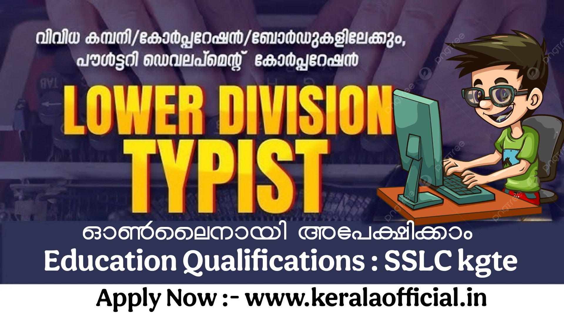 - ശ്രദ്ധിക്കുക: 2002 ജനുവരിക്ക് മുമ്പ് ഇംഗ്ലീഷ് ടൈപ്പ് റൈറ്റിംഗ് പാസായവർ കമ്പ്യൂട്ടർ വേർഡ് പ്രോസസ്സിംഗിൽ പ്രത്യേകം സർട്ടിഫിക്കറ്റ് നേടിയിരിക്കണം.