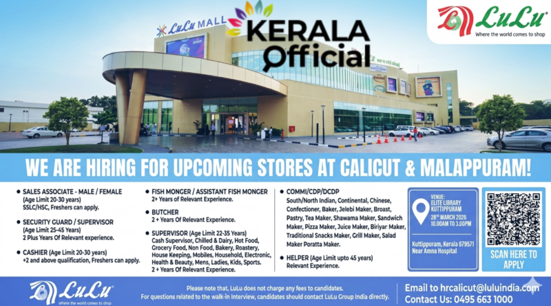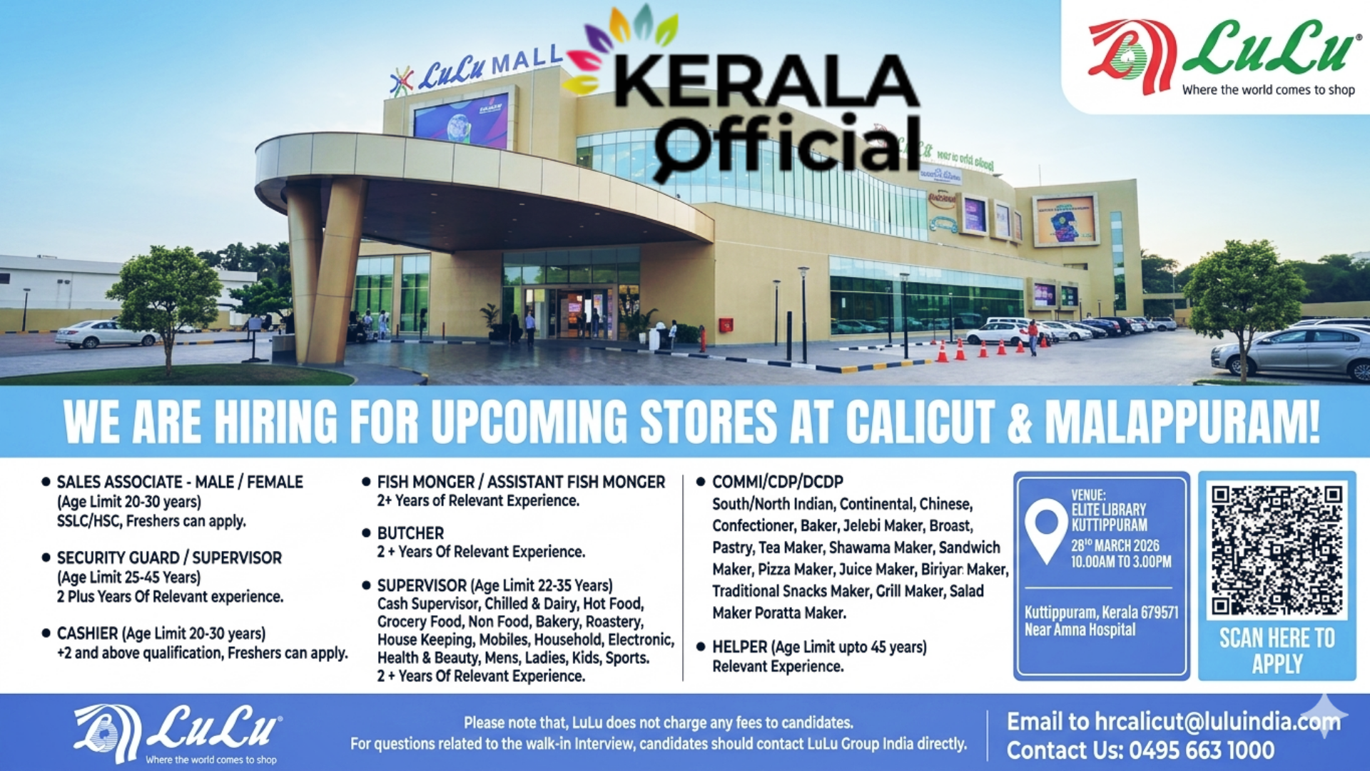 കോഴിക്കോട്, മലപ്പുറം എന്നിവിടങ്ങളിൽ ആരംഭിക്കുന്ന ലുലു മാളിന്റെ പുതിയ സ്റ്റോറുകളിലേക്ക് വിവിധ തസ്തികകളിലേക്ക് ഉദ്യോഗാർത്ഥികളെ ക്ഷണിച്ചുകൊണ്ടുള്ള അറിയിപ്പാണിത്. ഇതിന്റെ പ്രധാന വിവരങ്ങൾ താഴെ നൽകുന്നു: