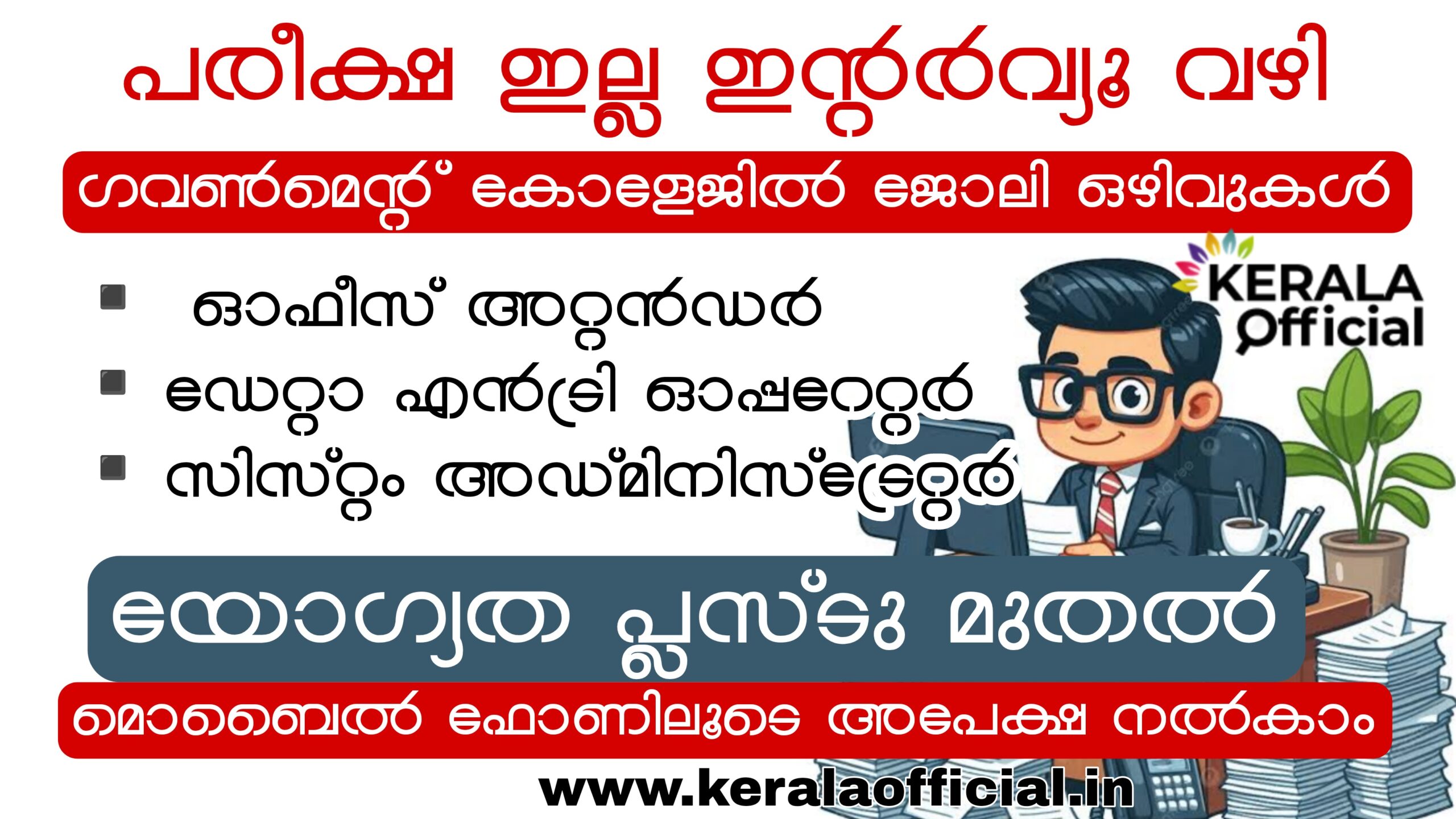 എറണാകുളം മഹാരാജാസ് കോളേജിലെ പരീക്ഷാ കൺട്രോളറുടെ ഓഫീസിലേക്ക് കരാർ/ദിവസവേതന അടിസ്ഥാനത്തിൽ നിയമനം നടത്തുന്നതിനായി യോഗ്യനായ നിന്നും അപേക്ഷകൾ ക്ഷണിക്കുന്നു