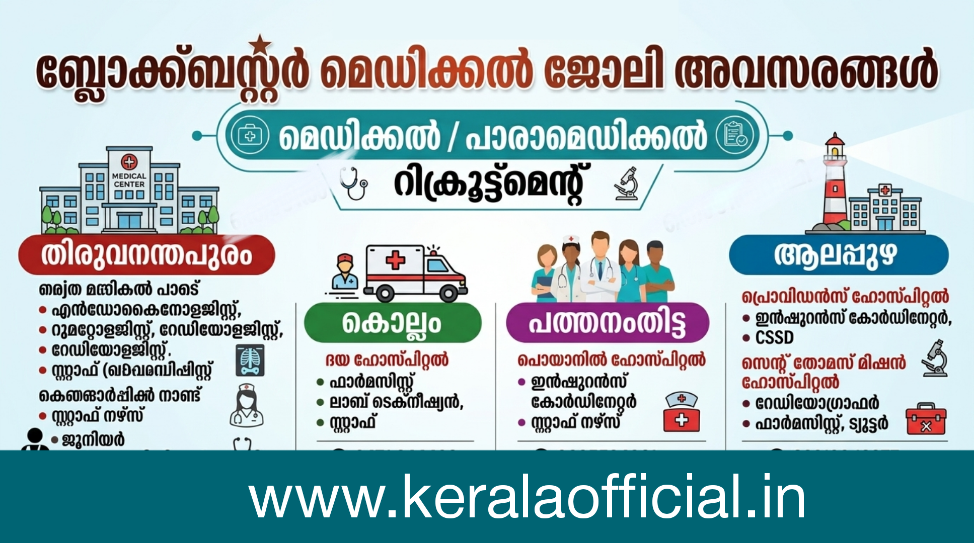 കേരളത്തിലെ വിവിധ ജില്ലകളിലായുള്ള ഹോസ്പിറ്റലുകളിൽ ഇപ്പോൾ വന്നിട്ടുള്ള മെഡിക്കൽ പാരാമെഡിക്കൽ ജോലി ഒഴിവുകൾ