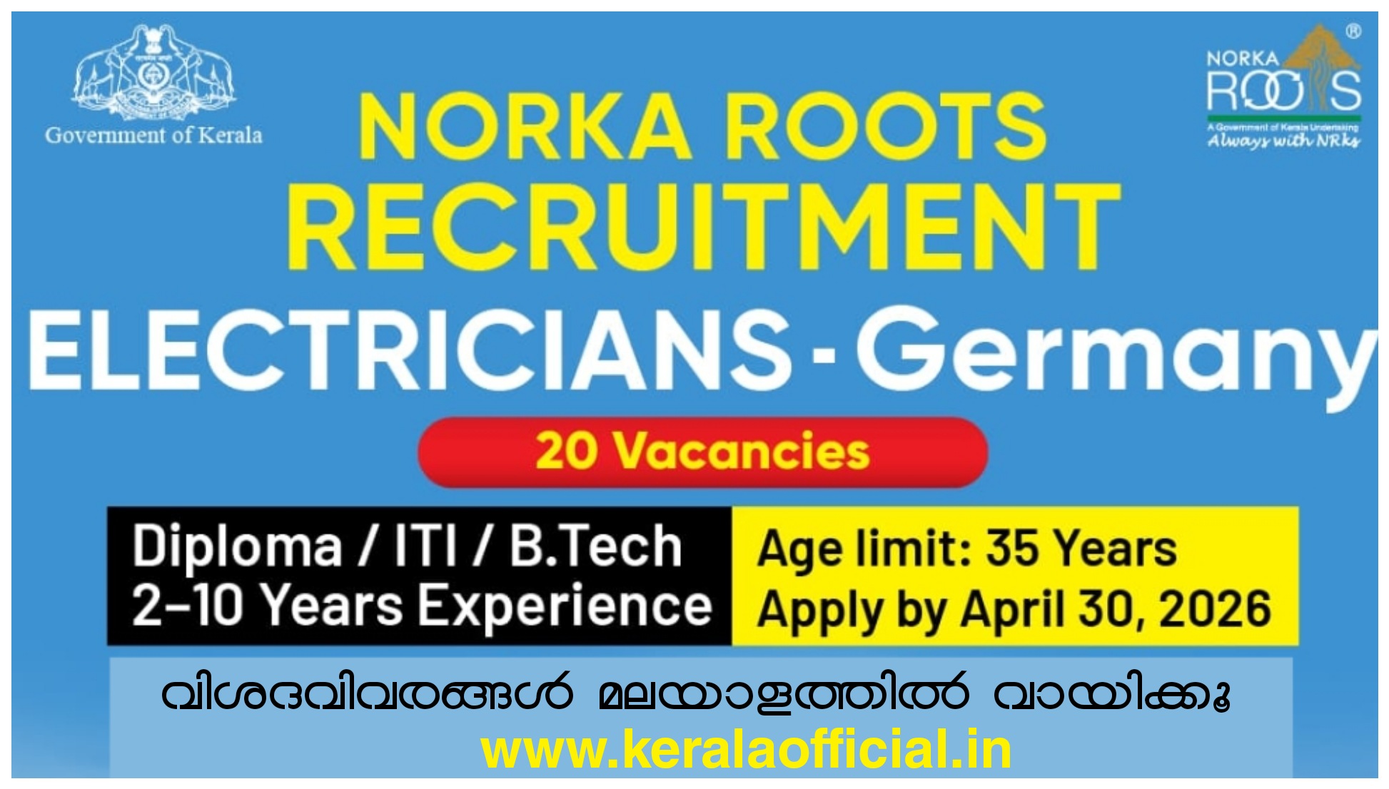 യൂറോപ്യൻ രാജ്യത്ത് ഒരു ജോലി വേണോ എന്നാൽ ഇതാ ജർമ്മനിയിലേക്ക് ഇലക്ട്രീഷ്യൻമാരെയും പാചകക്കാരെയും (Chefs) തിരഞ്ഞെടുക്കുന്നതിനായി നോർക്ക റൂട്ട്സും (NORKA Roots) ഇൻഡോ-ജർമ്മൻ ചേംബർ ഓഫ് കൊമേഴ്സും സംയുക്തമായി നടത്തുന്ന റിക്രൂട്ട്മെന്റിന്റെ പ്രധാന വിവരങ്ങൾ താഴെ നൽകുന്നു.