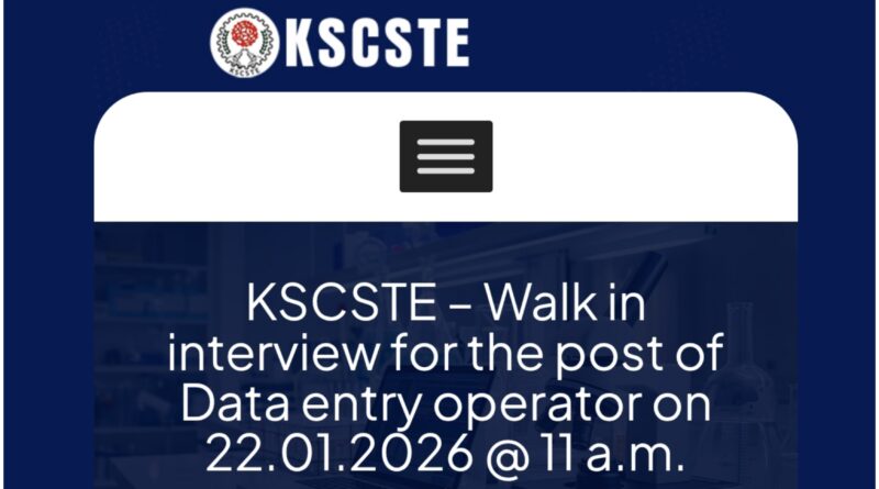 Read moreകേരള സ്റ്റേറ്റ് കൗൺസിൽ ഫോർ സയൻസ്, ടെക്നോളജി ആൻഡ് എൻവയോൺമെന്റ് (KSCSTE) നടത്തുന്ന ഡാറ്റാ എൻട്രി ഓപ്പറേറ്റർ തസ്തികയിലേക്കുള്ള വാക്ക്-ഇൻ ഇന്റർവ്യൂവിനെക്കുറിച്ചുള്ള പ്രധാന വിവരങ്ങൾ താഴെ നൽകുന്നു: