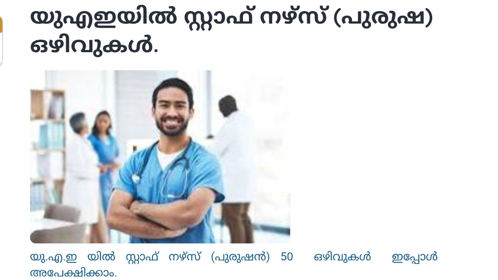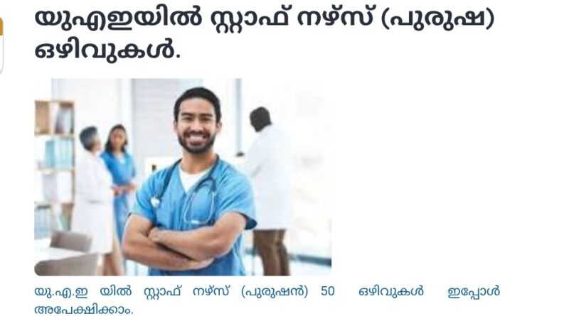 അബുദാബിയിലെ ഒരു പ്രമുഖ സ്വകാര്യ ആരോഗ്യ സ്ഥാപനത്തിലേക്ക് 50 പുരുഷ സ്റ്റാഫ് നഴ്സുമാരെ ആവശ്യമുണ്ട്. നോർക്ക റൂട്ട്സ് (NORKA Roots) വഴിയാണ് ഈ നിയമനം നടക്കുന്നത്.